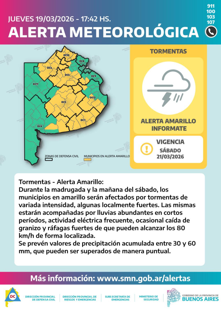 Para este jueves, el SMN emitió un alerta amarillo para el sur y extremo sur de la Provincia por fuertes tormentas. “El área será afectada por tormentas de variada intensidad, algunas localmente fuertes.