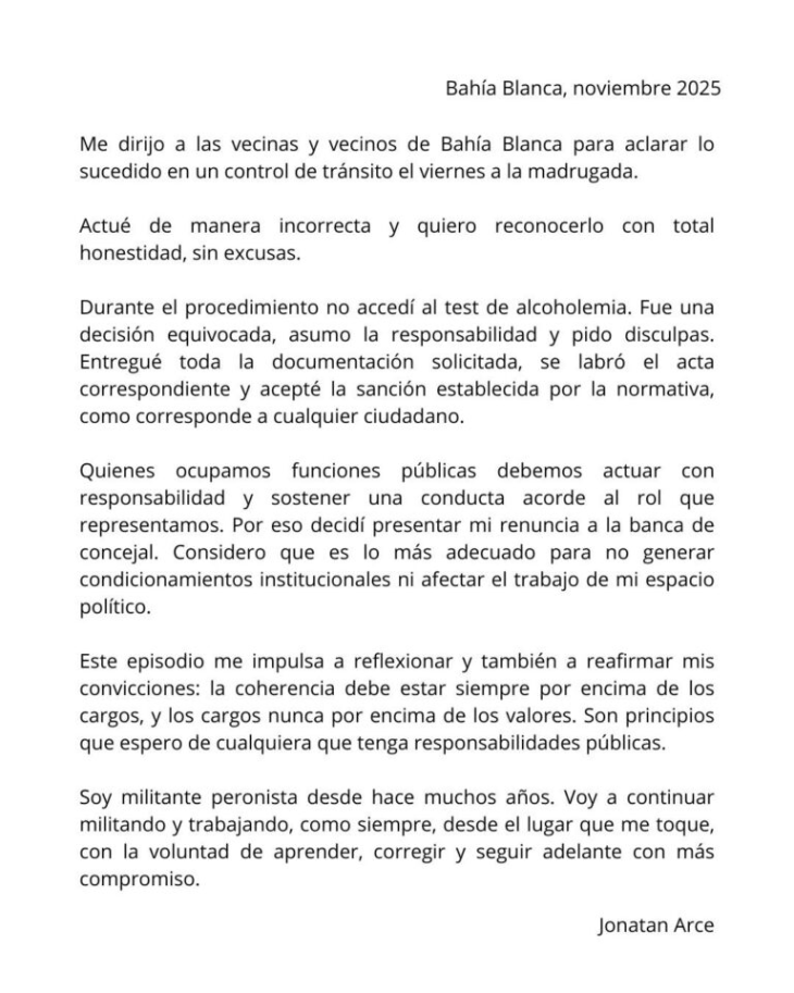 “Actué de manera incorrecta”, sostuvo Arce en el descargo público que difundió tras el hecho, donde además pidió disculpas y reconoció su responsabilidad. “Quienes ocupamos funciones públicas debemos actuar con responsabilidad”, explicó el entonces concejal, que agregó además que su renuncia buscó resguardar el funcionamiento institucional.