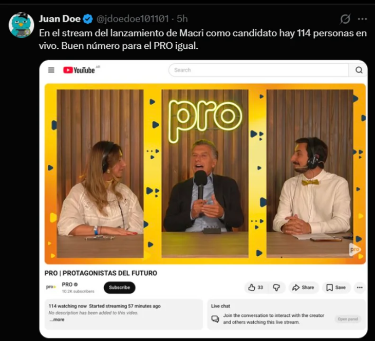 “En el stream del lanzamiento de Macri como candidato hay 114 personas en vivo. Buen número para el PRO igual”, expresó.