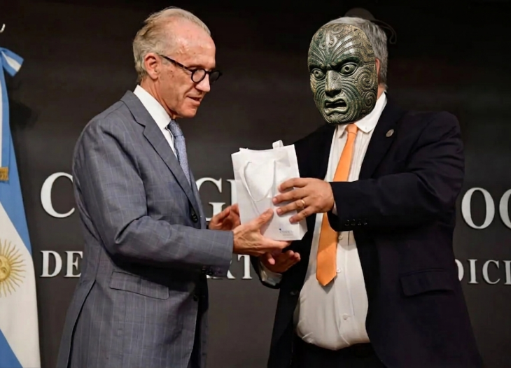 A algunos no le dio la cara. El radical Petraglia escondido detrás de la máscara, le entrega un "souvenir" al macrista Carlos Rosenkrantz