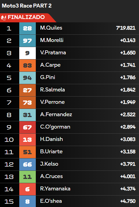 Con este resultado, Quiles tomó el primer puesto del campeonato con 45 puntos escoltado por Morelli (a 17 unidades), quien escaló seis lugares, y Pratama (a 18); Perrone está 7° (a 20).