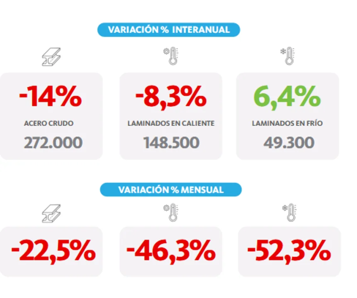 La producción de acero crudo cayó 22,5% en febrero respecto de enero último y 14% en comparación con el mismo mes del año anterior, según la cámara del sector.