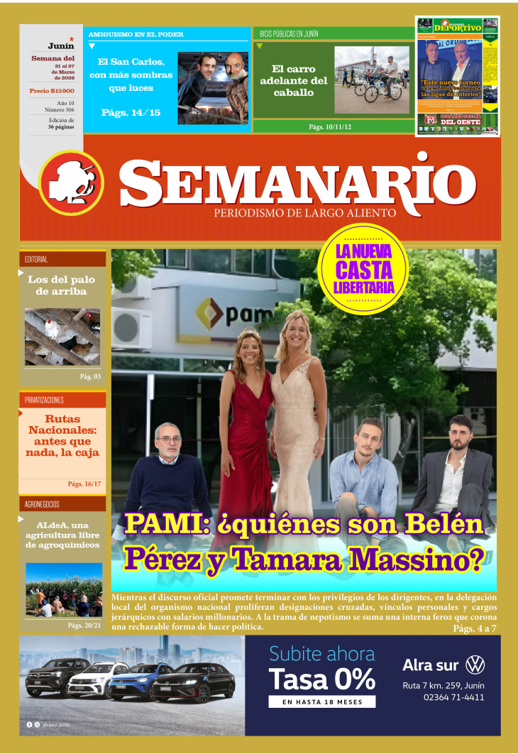 NOTA DE TAPA DE LA EDICIÓN IMPRESA Y EDICIÓN DIGITAL Nº 506 DE SEMANARIO DE JUNÍN. SEMANA DEL 21 AL 27 DE MARZO DE 2026