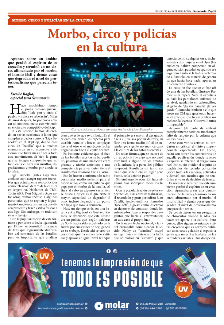 SECCIÓN HIPHOP PUBLICADA EN LA EDICIÓN IMPRESA Y EDICIÓN DIGITAL Nº 508 DE SEMANARIO DE JUNÍN. SEMANA DEL 4 AL 10 DE ABRIL DE 2026