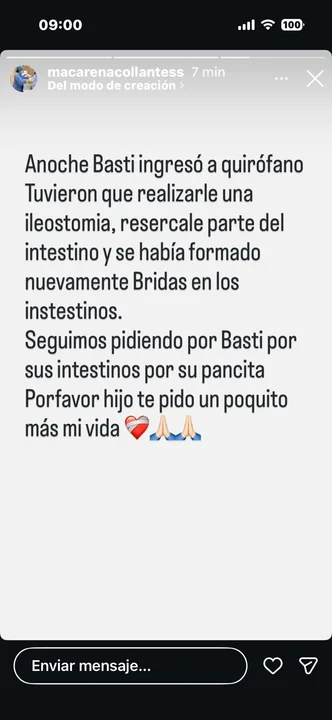 “Seguimos pidiendo por Basti, por sus intestinos, por su pancita. Por favor hijo, te pido un poquito más mi vida” agregó la madre Macarena Collantes en su comunicado en redes sociales.