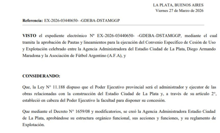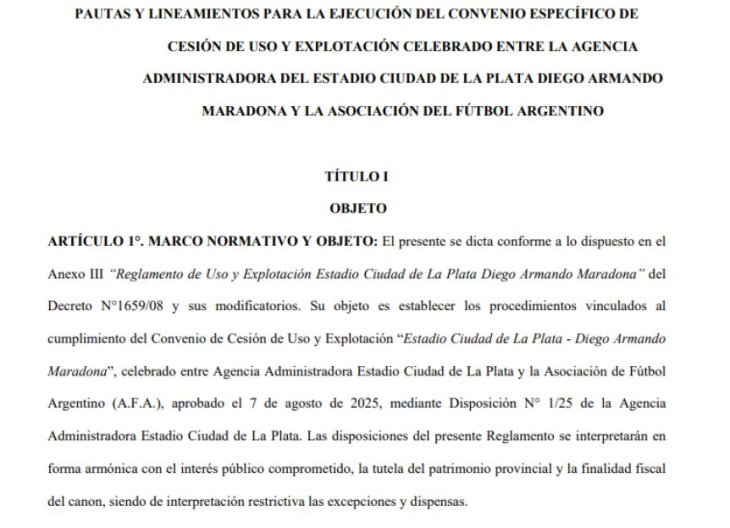 El documento reglamenta el acuerdo firmado en agosto de 2025 y detalla cómo se organizará la explotación del predio, qué tipo de actividades podrán realizarse, cuáles serán las obligaciones de mantenimiento e inversión y cómo se pagará el canon por el uso del estadio. Aunque el estadio continuará siendo propiedad del Estado bonaerense, el convenio establece que la AFA tendrá la posibilidad de utilizar y explotar el predio para eventos deportivos y espectáculos, bajo control y supervisión de la Provincia.