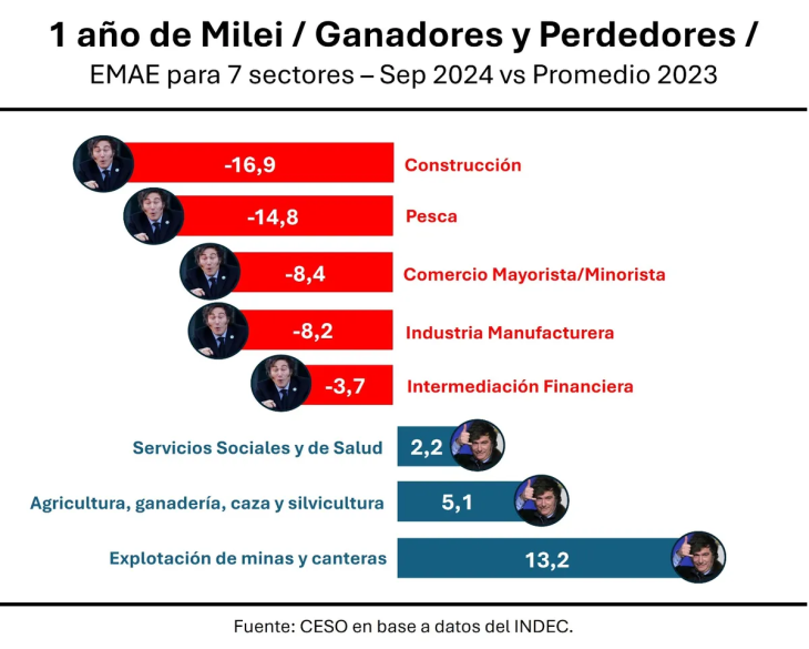 Los sectores que más ganaron desde que gobierna La Libertad Avanza fueron los de intermediación financiera con una suba del 25,2%; la explotación de minas y canteras con un crecimiento del 17,9%; el agro con 14,1% y el resto, como las actividades inmobiliarias y el transporte, 3,2 por ciento. En el otro extremo, aumentó el endeudamiento de las familias. La morosidad alcanzó el 10,6% en enero, el nivel más alto en dos décadas, lo que refleja el deterioro de los ingresos y la dificultad para afrontar gastos básicos de alimentos, medicamentos, servicios y alquiler.