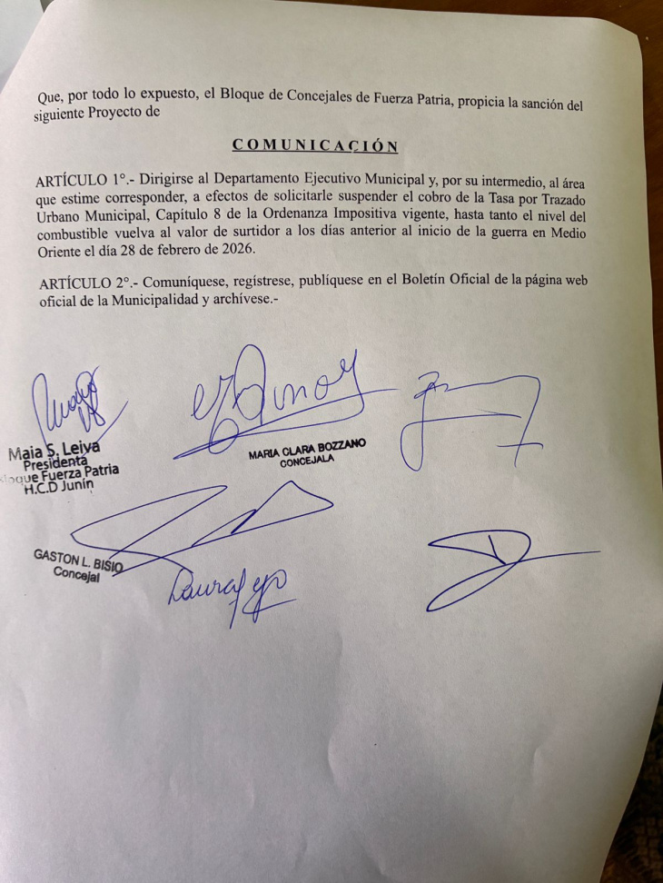 El bloque de concejales de Fuerza Patria presentó un proyecto de comunicación en el Honorable Concejo Deliberante de Junín solicitando al Departamento Ejecutivo Municipal la suspensión del cobro de la Tasa por Trazado Urbano Municipal que se aplica sobre la carga de combustibles en la ciudad.