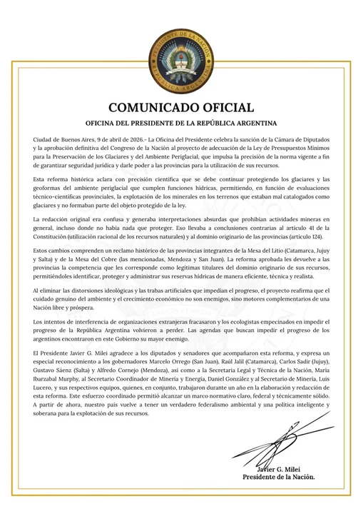El comunicado subraya que estos cambios responden a un reclamo histórico de las provincias integrantes de la Mesa del Litio (Catamarca, Jujuy y Salta) y de la Mesa del Cobre (Mendoza y San Juan). Además, el Ejecutivo reafirmó que el cuidado del ambiente y el crecimiento económico "no son enemigos, sino motores complementarios de una Nación libre y próspera".