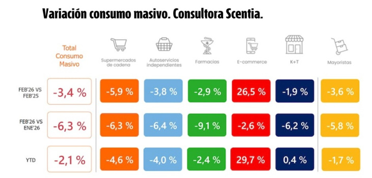 El canal de venta más afectado fue el de supermercados, donde el consumo se desplomó 5,9% interanual y un 6,3% en comparación con enero; mientras que el que tuvo un mejor desempeño fue el e−commerce con un avance anual del 26,5%, aunque con una baja del 2,6% mensual. Por su parte, en farmacia el consumo cayó 9,1% mensual, en autoservicios 6,4%, en kioscos un 6,2% y en mayoristas 5,8%. En consecuencia, en febrero todos los canales marcaron bajas.