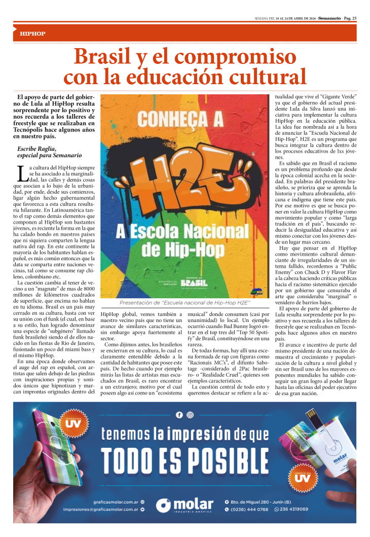 SECCIÓN HIPHOP PUBLICADA EN LA EDICIÓN IMPRESA Y EDICIÓN DIGITAL Nº 510 DE SEMANARIO DE JUNÍN. SEMANA DEL 18 AL 24 DE ABRIL DE 2026