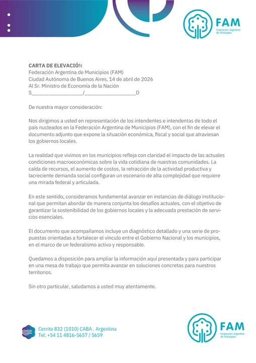 Luego de presentar un documento ante el Ministerio de Economía, la Federación Argentina de Municipios (FAM) avanzó en consultas con asesores letrados para impulsar una acción judicial si no se abre una instancia de diálogo para normalizar el flujo de recursos.