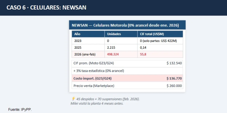 Lo mismo ocurre en el sector electrónico. Newsan, en Tierra del Fuego, pasó de importar partes para ensamblar celulares a traer equipos terminados (como los modelos Motorola G23/24). Esto vino de la mano de despidos y suspensiones a principios de 2026. Para los autores del informe, esta dinámica de importar para comercializar con márgenes elevados tiene un límite.