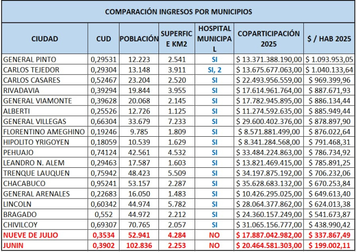 Las dos ciudades que menos recursos reciben por coparticipación en la región son Junín y Nueve de Julio.