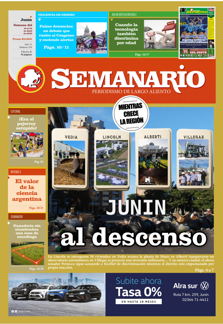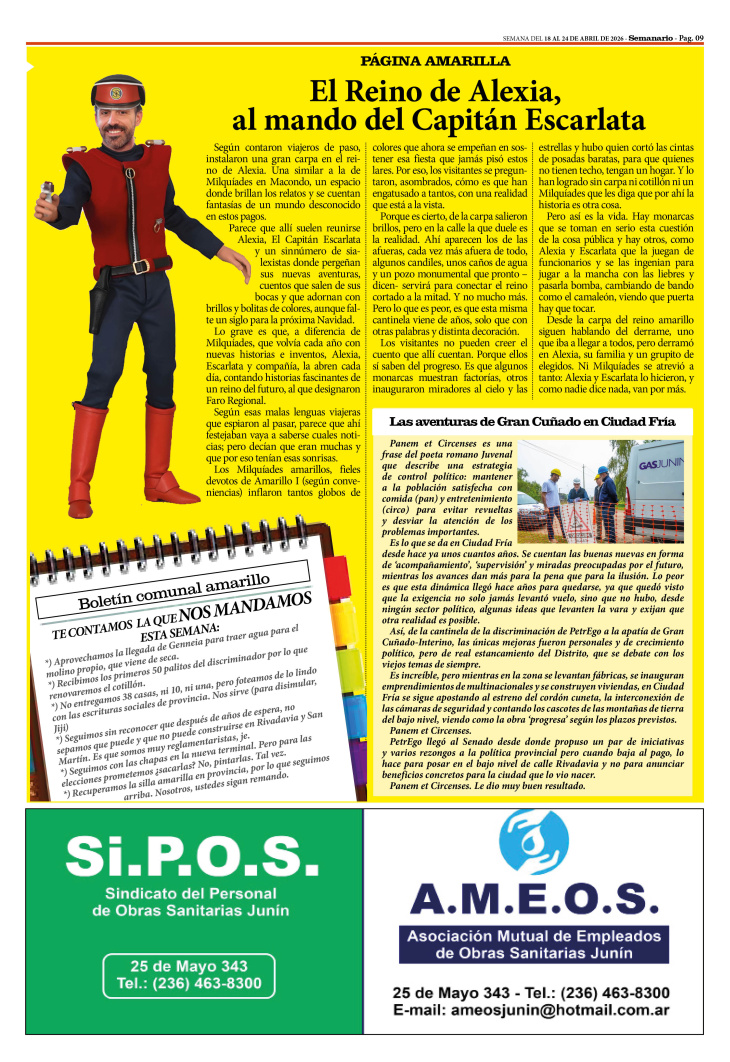PÁGINA DE HUMOR POLÍTICO PUBLICADA EN LA EDICIÓN IMPRESA Y EDICIÓN DIGITAL Nº 510 DE SEMANARIO DE JUNÍN. SEMANA DEL 18 AL 24 DE ABRIL DE 2026