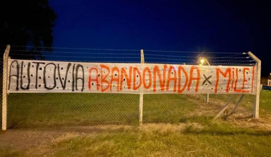 En las últimas horas, aparecieron pasacalles con críticas al presidente Javier Milei sobre la Ruta Nacional 7, a la altura de Chacabuco, en reclamo por el abandono de la obra de la Autovía.