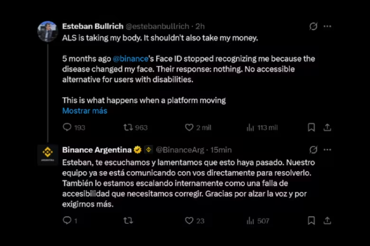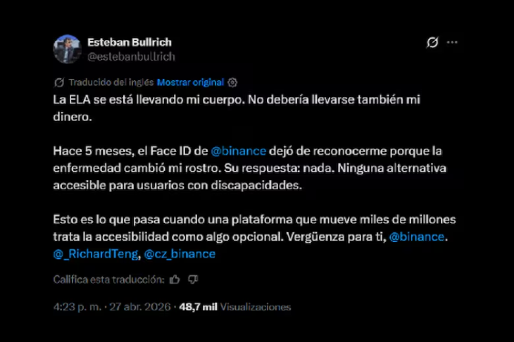 En un mensaje publicado en la red social X y dirigido a Richard Teng, actual CEO de Binance, el exministro de Educación expresó: “La ELA se está llevando mi cuerpo. No debería llevarse también mi dinero. Hace 5 meses, el Face ID de Binance dejó de reconocerme porque la enfermedad cambió mi rostro”.